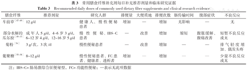 现有研究证实通过天然食物补充膳食纤维能够增加大便体积,改善大便质地,增加排便次数,减轻腹部症状。一项纳入7项随机对照试验(RCT)的Meta分析显示,147例成年FC患者中,113例(77%)对纤维素治疗有反应,而安慰剂组仅44%有反应,提示纤维素能够显著改善排便次数和软化大便,但有发生腹胀的风险[40]。一项纳入65项干预性试验的系统综述显示,小麦纤维摄入每增加1 g/d,大便总重量增加(3.70±0.09) g/d、干重增加(0.75±0.03)g/d(P<0.000 1)、排便次数增加(0.004±0.002)次/d(P=0.034 6)、结肠传输时间减少(0.78±0.13)h(P<0.000 1)[41]。一项比较了不同来源的膳食纤维对肠道功能影响的研究显示,对于可发酵纤维含量高的膳食纤维,来自谷物、水果、蔬菜的膳食纤维每增加1 g,大便重量分别增加1.29、0.28、2.91 g,谷物、蔬菜在肠道的传输时间分别加快0.69、0.87 h;对于可发酵纤维含量少的膳食纤维,来自谷物和蔬菜的纤维每增加1 g可使肠道传输时间加快0.67、0.47 h[42]。一项纳入6项RCT的系统综述发现,可溶性纤维与安慰剂相比可以改善排便的整体症状(86.5%和47.4%)、排便费力情况(55.6%和28.6%)、疼痛、大便性状,增加每周大便次数,缩短排便间隔时间[43]。