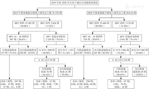 2019年石河子城区行宫颈癌筛查的妇女18 378例,2020年28 616例,2年共计46 994例。2年共检出LSIL 205例、HSIL 141例、CC 15例,分别占筛查总人数的0.44%、0.30%、0.03%。筛查流程及具体数据见图1。