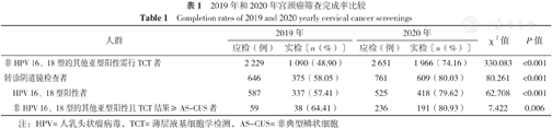 | 非HPV 16、18型的其他亚型阳性需行TCT者 | 2 229 | 1 090(48.90) | 2 651 | 1 966(74.16) | 330.083 | <0.001 | |
