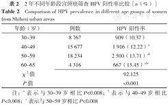 2年不同年龄段宫颈癌筛查妇女HPV阳性率比较,差异有统计学意义(P<0.05);40~49、50~59、60~65岁宫颈癌筛查妇女HPV阳性率高于30~39岁,差异有统计学意义(P<0.008);50~59、60~65岁宫颈癌筛查妇女HPV阳性率高于40~49岁,差异有统计学意义(P<0.008);60~65岁宫颈癌筛查妇女HPV阳性率高于50~59岁,差异有统计学意义(P<0.008),见表2。