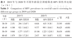 相较于2019年,2020年30~39、40~49、50~59、60~65岁宫颈癌筛查妇女HPV阳性率均有下降,差异有统计学意义(P<0.05),见表3。