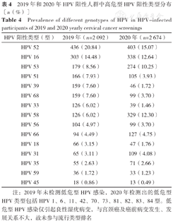 2年筛查均采用HPV分型检测技术作为初筛手段。2019年单一hrHPV感染类型及阳性率从高到低排列位于前5位的分别是:HPV 52型、HPV 16型、HPV 53型、HPV 51型和HPV 39/HPV 68型。2020年前5位分别是HPV 52型、HPV 16型、HPV 58型、HPV 53型和HPV 66型。对比2年的结果,可以看出在石河子城区宫颈癌筛查人群中,最常见的hrHPV感染类型为HPV 52型,其次是HPV 16型。而2年HPV 18型感染均排在第11位,阳性率分别为3.15%和1.76%,见表4。