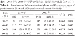 Prevalence of inflammation/condyloma in different age groups of participants in 2019 and 2020 yearly cervical cancer screenings