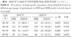 2020年30~39、40~49、50~59岁进行阴道镜检查的妇女LSIL阳性率高于2019年,差异有统计学意义(P<0.05);2019年与2020年60~65岁进行阴道镜检查的妇女LSIL阳性率比较,差异无统计学意义(P>0.05),见表7。