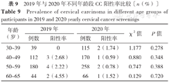 2019年与2020年30~39、40~49岁、50~59、60~65岁进行阴道镜检查的妇女HSIL、CC阳性率比较,差异无统计学意义(P>0.05),见表8,表9。