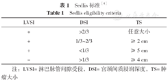 术后放疗适用于术后发现病理存在高危或中危因素,其中,高危因素包括淋巴结阳性、宫旁浸润、切缘阳性。具备任何一项高危因素时,均推荐术后补充盆腔放疗+顺铂同期化疗(证据等级1级)±阴道近距离放疗;阴道切缘阳性者,阴道近距离放疗可以增加疗效。中危因素包括淋巴脉管间隙受侵(lymph-vascular space invasion,LVSI)、宫颈间质浸润深度(deep stromal invasion,DSI)、肿瘤大小(tumor size,TS)。术后出现中危因素时,若病理组织学类型为鳞癌时,采用Sedlis标准[4](表1)选择进行补充盆腔外照射±含铂同期化疗(证据等级1级),如若出现LVSI,且DSI>2/3,则无论肿瘤有多大,均需进行补充盆腔外照射±含铂同期化疗;若为腺癌或腺鳞癌,则参照"四因素模型"(腺癌或腺鳞癌合并下面三项之一:肿瘤最大直径≥3 cm、LVSI、外1/3宫颈间质浸润),补充放疗可获益[4]。