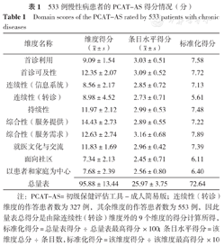 慢性病患者的PCAT-AS平均得分为(95.88±13.44)分。标准化得分最高的维度为综合性(服务需求)维度(7.89分),最低的为连续性(转诊)维度(5.61分),见表1。
