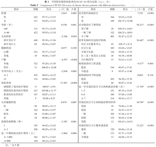 共回收有效问卷553份,问卷有效回收率为87.8%。慢性病患者PCAT-AS的平均得分为(95.88±13.44)分。其中,标准化得分较高的3个维度分别为综合性(服务需求)(7.89分)、首诊可及性(7.72分)、首诊利用(7.58分),标准化得分较低的3个维度分别为连续性(转诊)(5.61分)、面向社区(6.11分)、以患者和家庭为中心(6.40分)。多元线性回归分析结果显示:城乡类别〔农村低于城市,b(95%CI)=-6.983(-10.598,-3.368)〕、文化程度〔高中及以上高于初中及以下,b(95%CI)=4.046(0.966,7.125)〕、户籍〔本地低于常住,b(95%CI)=-5.360(-9.517,-1.202)〕、自评健康状况〔较差低于好,b(95%CI)=-4.962(-8.438,-1.486);差低于好,b(95%CI)=-7.787(-12.789,-2.786)〕、是否签约家庭医生〔已签约高于未签约,b(95%CI)=4.686(2.508,6.865)〕、患常见病时首选医疗机构〔社区卫生服务中心高于村卫生室,b(95%CI)=-5.865(-9.951,-1.779);社区卫生服务中心高于区(县)级及以上医院,b(95%CI)=-6.061(-11.330,-0.792)〕、近一年至基层医疗卫生机构就诊次数〔4~6次高于1~3次,b(95%CI)=5.876(3.367,8.384);≥7次高于1~3次,b(95%CI)=9.045(6.512,11.579)〕、对基层医疗卫生服务满意度〔满意高于一般,b(95%CI)=-2.844(-4.817,-0.870);满意高于不满意,b(95%CI)=-10.418(-17.050,-3.786)〕是慢性病患者PCAT-AS得分的影响因素。