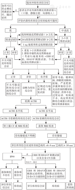 注:ACTH=促肾上腺皮质激素,CRH=促肾上腺皮质激素释放激素,DDAVP=去氨加压素,IPSS=岩下窦静脉采血;*共识认为所有病灶直径<6 mm的患者均应行IPSS,病灶≥10 mm的患者不需要IPSS,但专家对于病灶直径为6~9 mm的病灶意见尚未统一