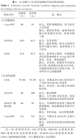 | LNSC | 75~90 | 93~95 | 优点:多数患者LNSC的异常早于DST和24 hUFC的异常缺点:多变性;易出现正常或阴性结果 | |
