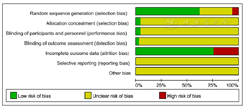 围绕误差风险(ROB)工具的7个评价条目评价结果如下:(1)随机序列产生:41项RCT提及随机数字表法(39项)、中央随机系统(2项)被评价为"低偏倚风险",4项RCT提及就诊顺序(3项)、单双号(1项)被评价为"高偏倚风险",21项RCT仅提及随机,未明确具体方式,被评价为"偏倚风险不确定"。(2)分配隐藏:3项RCT采用随机信封进行分配隐藏,被评价为"低偏倚风险",63项RCT未提及分配隐藏方式,被评价为"偏倚风险不确定"。(3)对患者、试验人员实施盲法:3项RCT对患者设置盲法,且盲法未破坏,被评价为"低偏倚风险",63项RCT未提及盲法及实施方式,被评价为"偏倚风险不确定"。(4)对结局评估者实施盲法:1项RCT对结局评估者设置盲法,1项RCT采用客观性结局指标,被评价为"低偏倚风险",64项RCT未报告对结局评估者设置盲法,评价为"偏倚风险不确定"。(5)结局数据不完整:50项RCT未报告不完整结局数据,被评价为"低偏倚风险",16项RCT被评价为"高偏倚风险"。(6)选择性报告偏倚:66项RCT均无试验设计方案,被评价为"偏倚风险不确定"。(7)其他偏倚:66项RCT未报告其他偏倚,且无试验设计方案,被评价为"偏倚风险不确定",见图2。