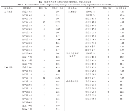 使用频次排名前5位的结局指标测量时点见表2。总有效率指标测量时点范围为治疗后7 d~随访6个月,共报告16个测量时点,以测量时点为治疗后14 d(27.08%)为主;疼痛视觉模拟评分法(VAS)评分指标测量时点范围为治疗后7 d~随访6个月,共报告13个测量时点,以测量时点为治疗后14 d(26.67%)为主;NDI评分指标测量时点范围为治疗后1 d~随访3个月,共报告12个测量时点,以测量时点为治疗后14 d(29.17%)为主;不良反应和不良事件指标测量时点范围为治疗后7 d~随访3个月,共报告8个测量时点,以测量时点为治疗后28 d(28.57%)为主;症状体征积分指标测量时点范围为治疗后14~35 d,共报告6个测量时点,以测量时点为治疗后14 d(33.33%)为主。
