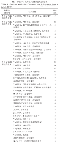 | 4个结局指标组合应用 | VAS评分,NDI评分,SF-36评分,总有效率 | 3 |