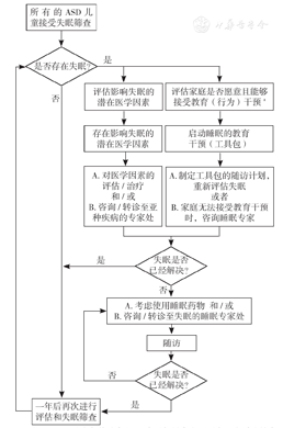 ATN共识制订了ASD儿童青少年失眠的识别、评估和管理临床实践路径(图1),并在4个机构进行可行性测试及优化调整。ATN共识推荐,ASD儿童均应接受失眠筛查,一旦确定存在失眠问题,应进行进一步评估,同时评估父母是否愿意先接受睡眠教育/行为干预。ATN共识将睡眠教育/行为干预作为一线治疗方法,如果父母不愿意或无法接受,则可考虑药物治疗,但父母仍需了解睡眠习惯知识。ATN共识认为在任何干预后均应进行随访,以评估治疗的有效性和耐受性,随访应在开始治疗后2周至1个月内进行,并期望在4周内观察到改善。及时的随访可以帮助父母调整干预措施,并在需要时提供转诊。在长期随访中(如1年),应重复实践路径开始时的步骤(从筛查是否存在失眠开始)。在ASD儿童的管理中,需要咨询睡眠专家的情况如下:(1)初步评估时服用多种睡眠药物;(2)失眠在初始干预措施下没有得到改善;(3)失眠特别严重,导致明显的日间损害或使孩子在夜间清醒时面临受伤的风险;(4)存在潜在导致失眠症状的睡眠障碍,包括睡眠呼吸暂停综合征、不宁腿综合征等。