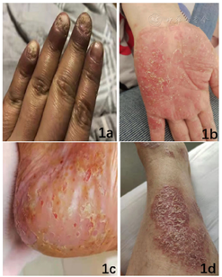 注:1a为指甲损害,1b为手掌脓疱疮,1c为足底脓疱疮、流黄色疱液,1d为下肢银屑病样皮损