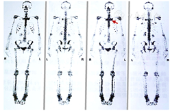 注:女,38岁,红色箭头处可见"牛头征";双侧胸锁关节、双侧锁骨近端(左侧较重)和胸骨柄可见放射性摄取增高区