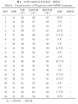 19例SAPHO综合征患者中女17例、男2例;平均发病年龄为(40±12)岁,平均确诊年龄为(43±12)岁,中位病程为1年;1例有强直性脊柱炎家族史,2例有掌跖脓疱疮家族史。见表1。