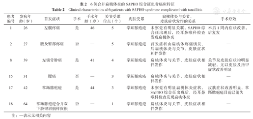 本组6例合并有扁桃体炎的患者中,4例患者关节疼痛及皮损症状与扁桃体疼痛相伴发生,2例患者诉自觉扁桃体疼痛不明显,后经耳鼻喉科检查发现扁桃体炎。6例患者均表现骨关节受累合并掌跖脓疱疮,其中1例除掌跖脓疱疮外,合并下肢银屑病样皮损。3例患者因反复发作的关节疼痛及掌跖脓疱疮行扁桃体切除术。2例患者术后症状得到改善,皮肤、指甲损害消失,术后1年内皮肤症状基本无复发;1例患者仅术后1周内自觉关节及皮肤症状减轻,但1周后关节及皮损症状复发。6例合并扁桃体炎的SAPHO综合征患者临床特征见表2。