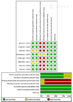 本研究纳入文献所应用的联合治疗方式有6种。经过Meta分析可见CD38单克隆抗体治疗复发性难治性多发性骨髓瘤(RRMM)患者具有良好疗效,但CD38单克隆抗体引起的药物毒副作用不容忽视,本研究中并未详细探讨这些毒副作用是否与配伍药物有相关性。(2)本文纳入了8项临床试验,有关Isatuximab的研究只有3篇,Isatuximab和Daratumumab作用机制基本相似,但仍有些许区别,故对8篇文献合并效应量时有潜在的异质性可能。