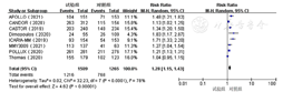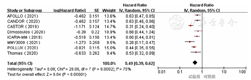本研究最终纳入8项RCT,共2 821例患者(其中试验组1 529例、对照组1 292例)。Meta分析结果:在疗效方面,试验组ORR、PFS、≥VGPR、MRD阴性率、≥CR均高于对照组〔RR=1.28,95%CI(1.15,1.43),P<0.000 01;HR=0.49,95%CI(0.39,0.62),P<0.000 01;RR=1.86,95%CI(1.53,2.27),P<0.000 01;RR=5.28,95%CI(2.80,9.96),P<0.001;RR=2.57,95%CI(1.89,3.50),P<0.001〕;试验组PR低于对照组〔RR=0.67,95%CI(0.53,0.86),P=0.002〕。在安全性方面,非血液系统不良事件中,试验组的上呼吸道感染、肺炎、支气管炎、腹泻、背痛发生率均高于对照组〔RR=1.55,95%CI(1.36,1.77),P<0.001;RR=1.34,95%CI(1.13,1.59),P<0.001;RR=1.64,95%CI(1.07,2.51),P=0.02;RR=1.49,95%CI(1.33,1.68),P<0.001;RR=1.29,95%CI(1.07,1.57),P=0.009〕;非血液系统≥3级不良事件发生率,试验组的上呼吸道感染、肺炎、腹泻、疲劳发生率高于对照组〔RR=1.99,95%CI(1.15,3.43),P=0.01;RR=1.30,95%CI(1.05,1.62),P=0.02;RR=2.44,95%CI(1.58,3.76),P<0.001;RR=1.75,95%CI(1.19,2.56),P=0.004〕;血液系统不良事件中,试验组的血小板减少发生率高于对照组〔RR=1.10,95%CI(1.01,1.20),P=0.02〕。
