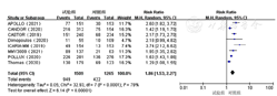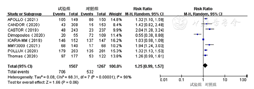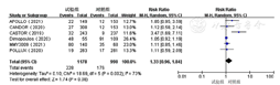 在安全性方面,试验组非血液系统不良事件中的呼吸系统感染发生率较高,可达72.5%。试验组上呼吸道感染、肺炎与支气管炎的发生率高于对照组。考虑试验组中感染的高发生率可能与血液系统不良事件中的中性粒细胞减少存在一定的关系,但本研究中试验组中性粒细胞减少的发生率与对照组比较,差异无统计学意义(P=0.06);如果增加纳入文献的数量可能会出现组间差异的改变。除此之外,试验组血小板减少的发生率为56.3%,位居本研究血液系统不良事件发生率的第一位,且明显高于对照组,提示试验组患者出血风险较对照组增加,这一结果与MATEOS等[12]研究结果一致。故在未来的临床工作中,应用CD38单克隆抗体治疗RRMM患者时要注意防范中性粒细胞缺乏所引起的各种类型感染以及由血小板减少所带来的致死性出血性并发症。