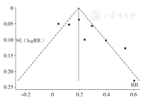 通过漏斗图检验试验组与对照组治疗RRMM的ORR的发表偏倚,结果显示各点分布较均匀,见图11;应用Egger's检验方法,结果显示P=0.075,表明存在发表偏倚可能性较小,见表4。