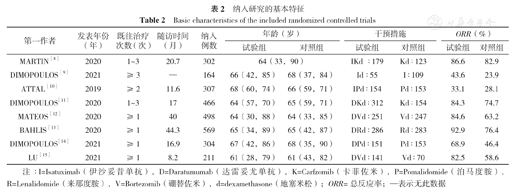 由2位研究者独立筛选文献,分别对阅读检索到的文献题目和摘要进行归类整理后,排除重复文献以及明显不符合纳入标准的文献,对于信息报告不全的文献联系原文作者补充相关信息,获得全文后再确定是否能纳入最后的研究中。如遇争议,由研究组协助解决。从最终纳入的文献中提取研究的基本特征包括:第一作者、发表年份、既往治疗次数、随访时间、纳入例数、年龄、干预措施、ORR。