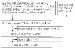 本研究开展时间为2021年7—9月。在中国知网、万方数据知识服务平台、维普网进行中文文献检索,检索时间设定为2010-07-01至2021-07-01;在PubMed、Web of Science、Scopus进行英文文献检索,检索时间设定为2000-01-01至2021-07-01。根据纳入与排除标准进行文献筛选,提取相关信息,根据研究对象和研究内容对文献进行分类分析。