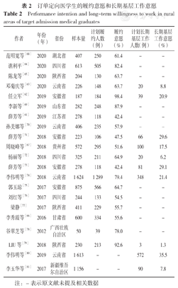 | 作者 | 年份(年) | 省份 | 样本量 | 计划履约人数(例) | 履约意愿(%) | 计划长期基层工作人数(例) | 长期基层工作意愿(%) |