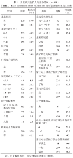 本研究开展时间为2021年3—7月,以0~14岁儿童为研究对象,以0~14岁儿童的监护人为调查对象。调查对象的抽取分线上、线下两部分:在广州市城区2家三级甲等综合医院、3家社区卫生服务中心,以及公园、广场等公共场所,开展线下偶遇抽样调查;借助"问卷星"平台开展目的抽样,通过微信群向儿童的监护人发放电子问卷。共回收问卷600份,包括线下问卷306份、线上问卷294份,其中有效问卷501份(线上242份、线下259份),问卷有效率为83.5%。调查对象纳入标准:(1)在广州市居住时间≥1个月;(2)有基层医疗卫生机构就医经历。排除标准:(1)存在认知功能障碍;(2)不愿配合调查。