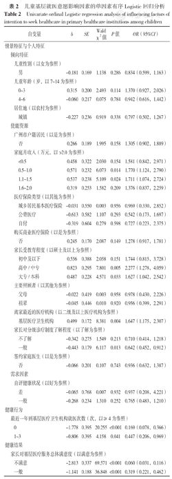采用SPSS 26.0统计软件进行数据分析。计数资料以相对数表示,儿童基层就医意愿的影响因素分析采用单因素有序Logistic回归和多因素有序Logistic回归。以P<0.05为差异有统计学意义。