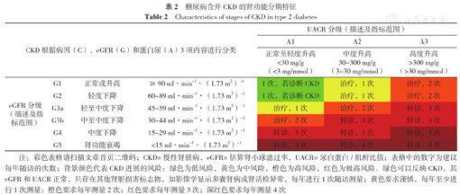 注:彩色表格请扫描文章首页二维码;CKD=慢性肾脏病,eGFR=估算肾小球滤过率,UACR=尿白蛋白/肌酐比值;表格中的数字为建议每年随访的次数;背景颜色代表CKD进展的风险:绿色为低风险,黄色为中风险,橙色为高风险,红色为极高风险。绿色可以反映CKD,其eGFR和UACR正常,只存在其他肾脏损害标志物,如影像学显示多囊肾病或肾活检异常,每年进行1次随访测量;黄色要求谨慎,每年至少进行1次测量;橙色要求每年测量2次;红色要求每年测量3次;深红色要求每年测量4次