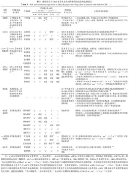 | TZD类 | 无肾脏获益推荐 | 罗格列酮 | √ | √ | √ | √ | √ | 水钠潴留风险,引起血浆容量的增加 | 对于纽约心脏学会心功能分级Ⅱ级以上的患者禁用[109] |