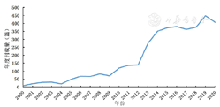 CiteSpace软件是基于共引理论和寻径算法、采用Java语言开发的用于计量特定研究领域文献的可视化软件,在寻找某一研究领域的研究进展、研究前沿及与其相对应的基础知识等方面具有较高的应用价值[4,5]。共词分析法是一种文献计量学方法,可通过对某研究领域关键词在文献中出现的总频次进行统计和分析而对该领域的研究热点和今后的发展态势进行展示[6]。本研究采用CiteSpace V5.7.R1软件完成对所获得文献高频关键词的提取,并进行共现及聚类分析,具体步骤如下:(1)采用Excel软件导出所获得的有效文献的基本信息,包括文题、作者、来源期刊、出版年、期等,以分析文献增长规律和来源。(2)将所获得有效文献的基本信息以Refworks格式导出,采用CiteSpace软件进行数据转换,分析时间跨度设置为2000—2020年,时间区分设置为1年,节点类型中选择"Keyword"进行关键词共现分析,节点阈值选择Top 50 per slice。(3)关键词共现分析对象为所获得有效文献的关键词,得出的共现关系网络能反映关键词出现频率及当前研究热点,其中高频关键词指出现频次较高的关键词;关键词中心性可反映测量节点在网络中的重要性,通过该指标可发现并衡量关键词的重要性,关键词中心性不低于0.1的节点被称为关键节点[7]。(4)设置"Burstness"(突发性节点)以展现研究热点的变化特征,并采用中心度测量方法,从标题、摘要、检索词和文献记录标识符中提取突现词以梳理出关键节点相关文献的演进,进而反映研究热点随时间变化趋势。