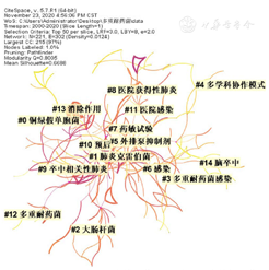 通过关键词聚类分析将关键词共现关系网络聚类为15个"簇"(图3),其中模块值为0.800 5,平均轮廓值为0.668 8;进一步对15个"簇"进行划分发现,多重耐药菌研究主要围绕以下4个主题展开:多重耐药菌种(聚类#0、#1、#2、#12)、多重耐药菌感染及预后(聚类#3、#6、#10、#11)、引发多重耐药菌感染疾病(聚类#8、#9、#14)、多重耐药菌产生机制及防控(聚类#4、#5、#7、#13)。