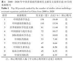 本研究结果显示,所获得的3 808篇有效文献中发表在核心期刊者仅占47.03%,而发文量排在前10位的来源期刊所刊载的相关文献仅占18.59%,提示2000—2020年刊载我国多重耐药菌相关研究的期刊分布比较分散,且核心期刊刊载量有限。因此,今后还应继续开展多重耐药菌高水平研究,以科学、有效地延缓细菌耐药的发生和发展。