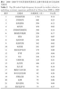 2000—2020年中国多重耐药菌相关文献中排在前20位的高频关键词