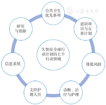 为了降低失智症的患病率和痴呆的发生风险,WHO于2017年5月发布"全球行动计划",倡导各国将失智症列为公共卫生优先事项,加大对失智症防治领域的投资,提高公众对失智症的重视程度。这一举措标志着全球在改善失智症患者及其照顾者的生理、心理、社会福祉方面迈出了重要一步。该计划为个人、社区及成员国提供了一个美好愿景,即预防失智症,让失智症患者及其照顾者和家庭得到照顾和支持,过上有意义、有尊严的生活。WHO期待通过与成员国和非国家行为体,包括失智症患者及其家庭一道努力,从7个优先领域出发实现"全球行动计划"中提出的宏伟目标:(1)把失智症作为公共卫生重点来制定或更新国家失智症政策、战略、计划或框架;(2)鼓励社会各界提高认识,制定友好计划,确保患者参与更广泛的文化娱乐、社区活动;(3)将失智症计划与降低非传染性疾病发生风险和促进健康的相关规划、政策及运动联系起来,主动管理可改变的风险因素;(4)提供有关的诊断信息,培训医疗卫生人员为患者提供循证治疗,促进以社区为基础的康复和护理;(5)为卫生保健和社会护理人员提供培训计划,制定或加强对照顾者社会福利、反歧视、就业的保护;(6)开发失智症信息系统,收集和监测流行病学核心指标;(7)以可持续、成本效益高的方式加强各国在失智症预防、降低风险、治疗和护理等方面研究、开发、创新的能力(图1)。"全球行动计划"提高了对失智症带来的公共卫生挑战的认识,强调采取协调、有序的全球行动的必要性。