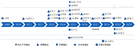 注:本图展示截至2021年12月各国家(地区)公开向社会发布的国家(地区)层面的失智症最新版行动计划发布时间