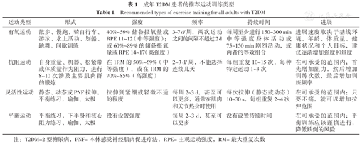 2010年版指南围绕不同身体活动的类型、频率、强度、持续时间、模式及进展率等进行阐述,且2010年版指南的身体活动推荐主要针对的是成年T2DM患者,并无明确的青少年和老年T2DM患者身体活动建议。与2010年版指南相比,2022年版指南基于当前大量科学实证研究,针对不同年龄段T2DM患者身体发育特征,围绕不同运动类型对生理指标的影响进行指导,提出了比较详细且合理的身体活动建议(表1)。2022年版指南指出,所有年龄段的成年人身体活动建议都是相同的,对各年龄段T2DM患者身体活动的建议主要参照2018年更新的《美国人体育锻炼指南》[9,10],对伴有其他疾病或疾病已经影响活动能力的老年人,则需要根据老年人的各项指标进行调整。
