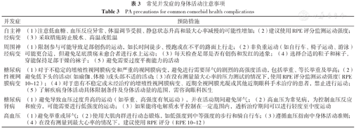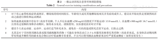 2022年版指南强调,需重点关注与运动有关的低血糖和高血糖。此外,2022年版指南对2010年版指南中身体活动的长期并发症进行了高度凝练,同时新增了预防热应激的注意事项,总结出身体活动一般注意事项(表2)及常见慢性并发症的身体活动注意事项(表3)。当T2DM患者出现这些健康问题时,其活动计划就需要调整,以确保患者参与身体活动的安全性和有效性。