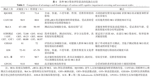 | CERAD | 81 | 72 | 评估的认知域较全面,对健康人群和MCI的鉴别有很高的准确性 | 除了单词列表学习测试,其他子测试筛查MCI的灵敏度或特异度不稳定 |