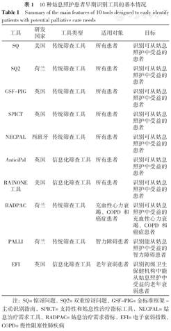 本研究对10种姑息照护识别工具进行了综述,10种工具均来自国外。其中4种工具(GSF-PIG、SPICT、AnticiPal和EFI)由英国学者研制,3种工具(SQ2、RADPAC、PALLI)由荷兰学者研制,2种工具(SQ、RAINONE工具)来自美国,1种工具(NECPAL)来自西班牙。姑息照护的对象一般为处于生命终末期的患者,而姑息照护常与生死话题相联系。受我国传统文化的影响,人们多忌讳谈论与死亡相关的话题,这也在一定程度上导致我国安宁疗护和姑息照护事业尚处于理论引入和实践探索阶段,现存姑息照护患者识别工具多由欧美等姑息照护服务高水平发展的国家(地区)的学者研制。AnticiPal、RAINONE工具、EFI为信息化筛查工具,其余的7种识别工具均为传统筛查工具。10种工具的研制目的为帮助医疗服务提供者尽早识别出具有潜在姑息照护需求的疾病终末期患者,其中RADPAC的适用对象为充血性心力衰竭、慢性阻塞性肺疾病和癌症患者,PALLI的适用对象为智力障碍患者,EFI的适用对象为老年衰弱患者,其余7种工具均可用于识别可从姑息照护中获益的癌症患者和大部分慢性病患者。10种姑息照护患者早期识别工具的基本情况见表1。