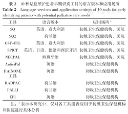10种工具均可供初级卫生保健机构中的全科医生使用,SQ、SQ2、GSF-PIG、SPICT和NECPAL还可用于医院环境中姑息照护潜在获益人群的早期识别,见表2。