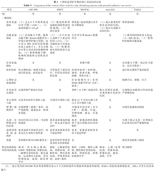 10种工具中,GSF-PIG涉及的内容最为全面,也是目前唯一被我国学者应用于研究的工具[44]。GSF-PIG、NECPAL、PALLI由SQ、一般指标和特定疾病指标3部分构成;SPICT和AnticiPal由一般指标和特定疾病指标2部分构成;而RADPAC仅由特定疾病指标组成。一般指标方面:GSF-PIG中的一般指标包括9个方面;NECPAL和PALLI则在保留GSF-PIG主要一般指标类别的基础上增加了心理衰退和认知功能衰退情况两方面的指标;与其他包含一般指标的工具相比,SPICT中的一般指标数量较少且仅涉及7个方面。特定疾病指标情况方面,GSF-PIG提供了12种特定疾病相关的指标,SPICT提供了8种,AnticiPal提供了7种,NECPAL提供了8种,RADPAC提供了3种。因GSF-PIG、SPICT、NECPAL、AnticiPal和PALLI 5种工具均包含一般指标和特定疾病指标,但考虑到同一指标在不同工具中的具体内容可能有所不同,故对上述5种工具的具体内容进行详细呈现与比较,见表3。