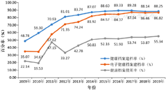2009—2019年,健康档案建档率、电子健康档案建档率和健康档案使用率均有大幅增长,健康档案建档率从2009年的48.78%上升到2019年的88.25%,平均年增长率为6.41%;电子健康档案建档率从2009年的35.07%上升到2019年的86.82%,平均年增长率为10.92%;健康档案使用率从2009年的22.14%上升到2019年的55.34%,平均年增长率为15.62%,见图1。