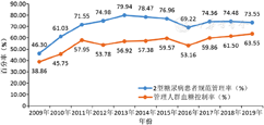2009—2019年全国高血压患者规范管理率分布情况(%)