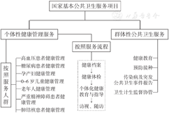 将国家基本公共卫生服务项目分为两大类:以个性化服务为特征的健康管理类服务和以群体性服务为特征的公共卫生类服务,如图4所示,其中,以社区(乡镇)为基础的人群健康管理是国家基本公共卫生服务项目的重要特色,项目涵盖了高血压患者健康管理、糖尿病患者健康管理、老年人健康管理、0~6岁儿童健康管理、孕产妇健康管理几个核心项目,为重点人群提供了健康管理服务,虽然,目前的健康管理服务还是以"基本性"服务为主,服务内容和质量均有待进一步提高,但通过十年努力,我国人群基于社区(乡镇)的人群健康管理模式已经形成,这为我国未来大力、全面、深入开展多样化的人群健康管理服务奠定了良好的基础。