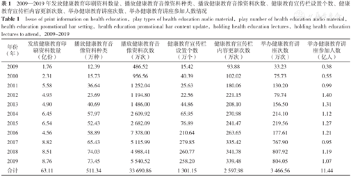2009—2019年发放健康教育印刷资料数量、播放健康教育音像资料种类、播放健康教育音像资料次数、健康教育宣传栏设置个数、健康教育宣传栏内容更新次数、举办健康教育讲座次数、举办健康教育讲座参加人数情况
