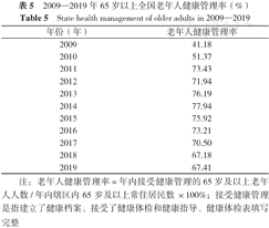 2020年全国第七次人口普查数据显示,65岁以上人口占比达13.5%[11],快速老龄化对我国老年人健康管理提出了新挑战。随着老龄化进程的加剧,我国老年人的失能问题日益严重,且老年人健康水平总体较低[12]。老年人健康管理的有效实施是老年人口健康基本权利得到维护与保障的重要表现,有利于维护老年人健康水平和健康公平性,是应对人口老龄化的重要措施之一[9]。截至2019年,全国老年人健康管理率达67.63%,较2009年增长了26.45%;基本公共卫生服务项目为全体老年人提供了基础性体检项目,对老年慢性病的早发现、早诊断起到了重要作用。